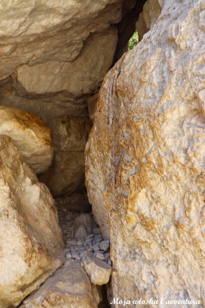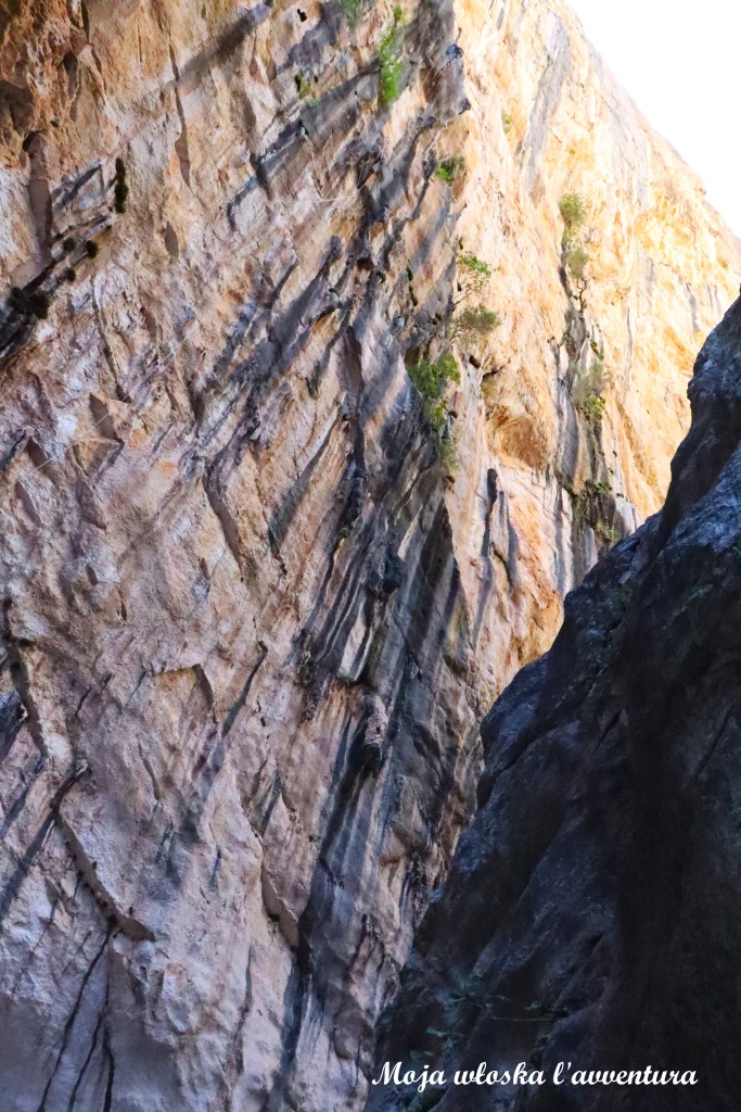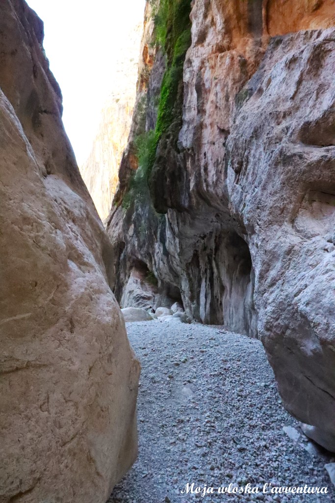 Od pierwszych metrów wąwóz wymaga uważności i zaangażowania. Trzeba miejscami wspinać się po skałach, przeciskać przez wąskie przejścia, a czasem zjeżdżać po gładkich fragmentach – także na siedząco – by bezpiecznie przejść dalej. Skalne ściany są ogromne i bardzo bliskie; z każdym kolejnym odcinkiem przestrzeń zdaje się coraz bardziej zwężać. Zdjęcia nie oddają skali tego miejsca – poczucie zamknięcia i ciężaru skał jest czymś, co naprawdę się tu czuje.