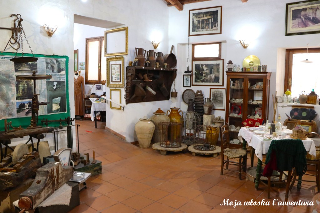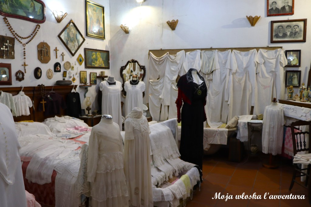 Zwiedzanie Zungri warto rozpocząć od jego historycznego centrum, a jeszcze lepiej od Muzeum Kultury Chłopskiej. Tuż obok Muzeum znajduję się parking, a bilet wstępu kosztuje 5 euro, ulgowy 4 euro. Muzeum znajduje się w dawnym młynie i zostało utworzone w 2003 roku. Na stosunkowo małej przestrzeni znalazło się ponad 3000 eksponatów. Umownie zbiory podzielone są na 5 sekcji tematycznych obejmujących: rolnictwo, tkactwo, kuźnię, odzież i wyposażenie domu. Dla nas interesujące były dwie ostatnie sekcje, w których mogliśmy zobaczyć kalabryjskie stroje ludowe, strój żałobny, typowe kobiece nakrycie głowy oraz wnętrze tradycyjnej sypialni, w której centralne miejsce zajmował panieński posag. Ale też istnieje druga strona medalu – zgromadzenie tak wielkiej ilości kolekcji na tak małej przestrzeni może powodować poczucie przytłoczenia i chaosu. Jednak myślę, że Muzeum jest dobrym wprowadzeniem do historii tego miejsca. Tuż za muzeum (w cenie biletu) czeka nas spacer do skalnej osady.